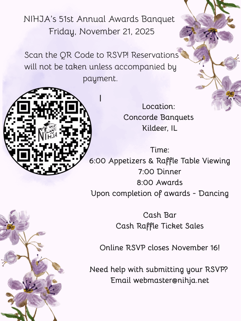 The 2025 Annual NIHJA Meeting will be held Monday, October 27 at 6:00 PM at the Concorde Banquets in Kildeer.
